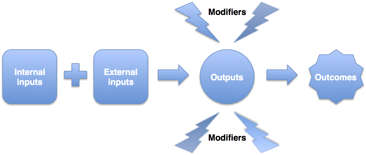 What’s going on here? First, internal inputs are combining with external inputs to create outputs. Then, modifiers are acting on those outputs to transform them into outcomes. It’s a bit like a factory; you put in raw materials (inputs), you get products (outputs), and then, if you can sell them at a good price under the current conditions in the market (modifiers), you earn a profit (outcome).