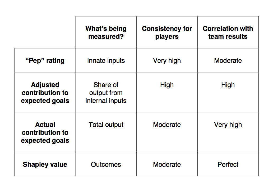 NYA has developed several kinds of ratings to capture different aspects of performance. The “Pep” rating, so named because of a quote from Pep Guardiola’s recent biography, only looks at players’ ability to maintain possession. The adjusted contribution to expected goals, explained here, tries to control for the effects of a player’s teammates. The total contribution can be compared to the adjusted contribution to see if players are fulfilling their potential. And the Shapley value, in its simplest form, can measure how pivotal players are in achieving final results – goals, points, positions, or whatever outcome is selected. Here is how they stack up: