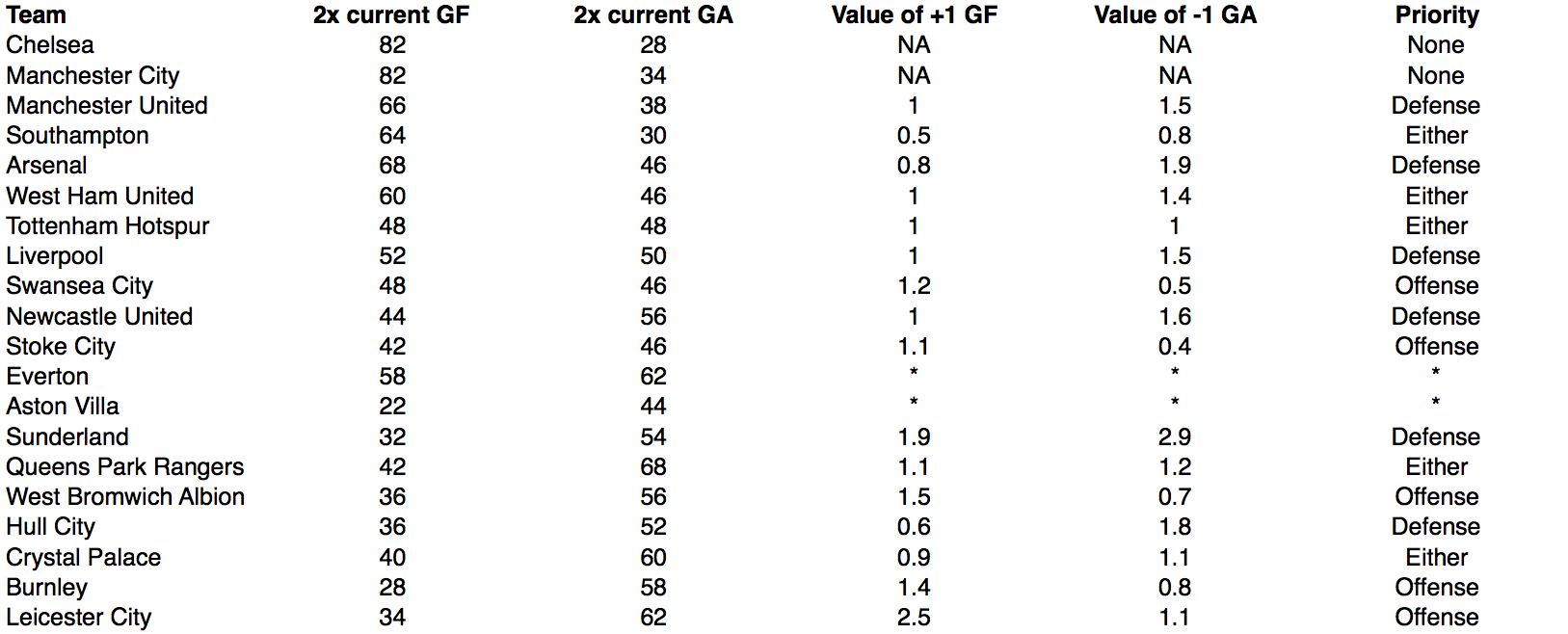With half the English Premier League season gone, the January transfer window is opening. Some time ago, NYA developed a powerful algorithm for determining clubs’ top priorities for improvement. Based on historical tables, the algorithm projects how changes in goals scored and goals conceded would affect a team’s likely finishes in the league for several seasons to come. I’ve dusted off the algorithm and updated it to offer some guidance in this window.
