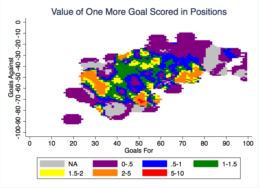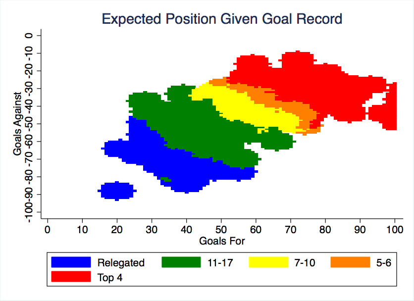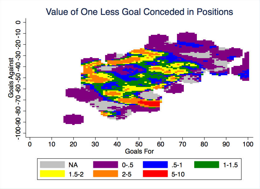 The original version of the algorithm places a cash value, at the margin, on goals scored and conceded based on a club’s current league position. The values, which are based on payments from competitions, tend to be biggest for clubs on the edge of the relegation zone or on the verge of qualifying for Europe. But to simplify matters, I’ll just stick to positions for this exercise. I want to know whether enhancing offense or defense would make moving up the table more likely.