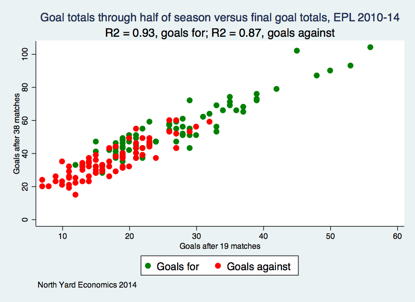 So what should the teams in the current window do? For simplicity, I’m going to assume that they’re on track to finish the season with double their current totals for goals scored and conceded. That’s a pretty fair assumption these days, given this graph from four recent seasons: