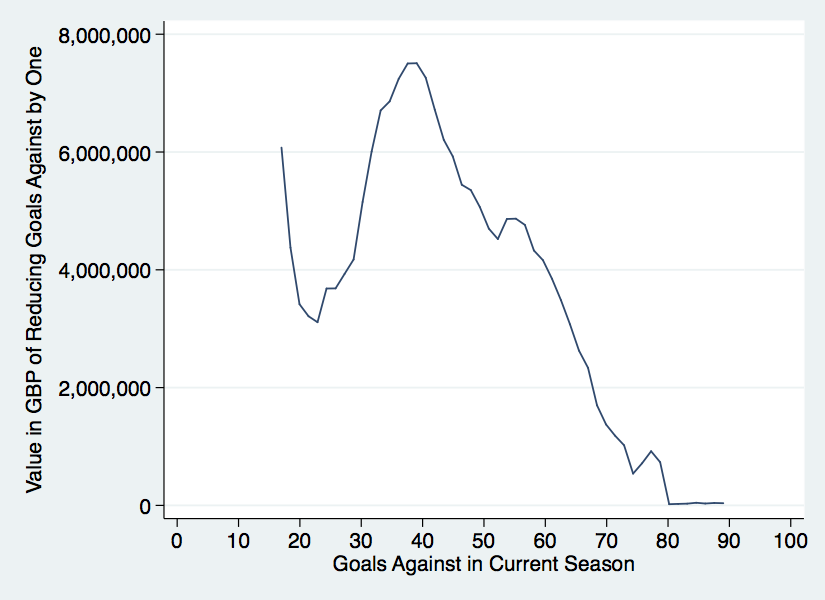 Similar relationships hold for goals against, but the value of conceding one less goal is not necessarily the same as the value of scoring one more goal for teams at a given position in the table. Here is a graph of the value over five years of the marginal goal against, depending on the total number of goals likely to be conceded: