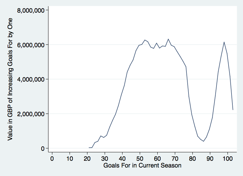 What does differ here is the overall relationship. The value of conceding one less goal peaks more sharply than the value of scoring one more goal, and it also tops out at a higher figure – close to £7,500,000 over five years! But for teams in the lower and middle reaches of the table, the value of a goal scored rises much more steeply (about £5,000,000 between 30 and 50 goals for) than the value of not conceding (about £3,000,000 between 70 and 50 goals against).