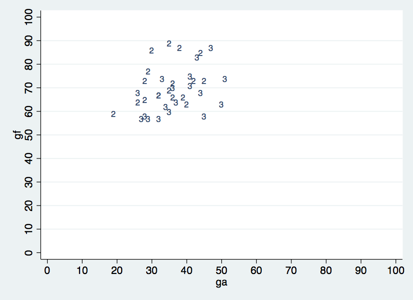 In the future, I’m going to extend this work by evaluating the two marginal changes simultaneously. I’ll put teams on a two-dimensional plane where the axes are goals scored and conceded, and then I’ll check whether horizontal or vertical moves are likely to bring them towards higher league places. This is a complicated exercise, since it can involve assessing the proximity to other points on the plane using formulas akin to those that describe gravitational fields. For example, consider the cluster of historical second- and third-place Premier League finishes in the graph below. Is a team whose goal record places it in the middle of this cluster more likely to finish second or third?