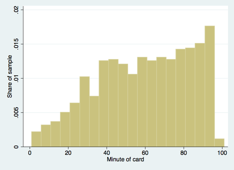 There are several ways of interpreting this graph. Perhaps the easiest is to say that Y% of players won’t make it X minutes after their first card without receiving a second. The graph ends at 95 minutes, at which point 3.8% of the players carrying a first yellow have received a second yellow. The probability isn’t completely linear; by 48 minutes after the first yellow (equivalent to about half a game), just 1.5% of the players would have been expected to receive a second yellow.