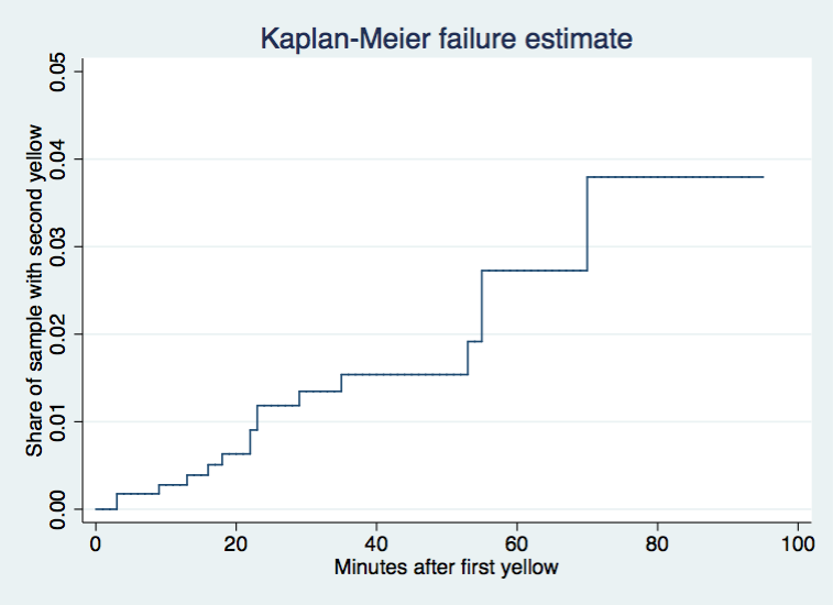 In this case, the cumulative probability of receiving a second yellow, depending on the number of minutes played after the first yellow, is given by the estimates in the following graph: