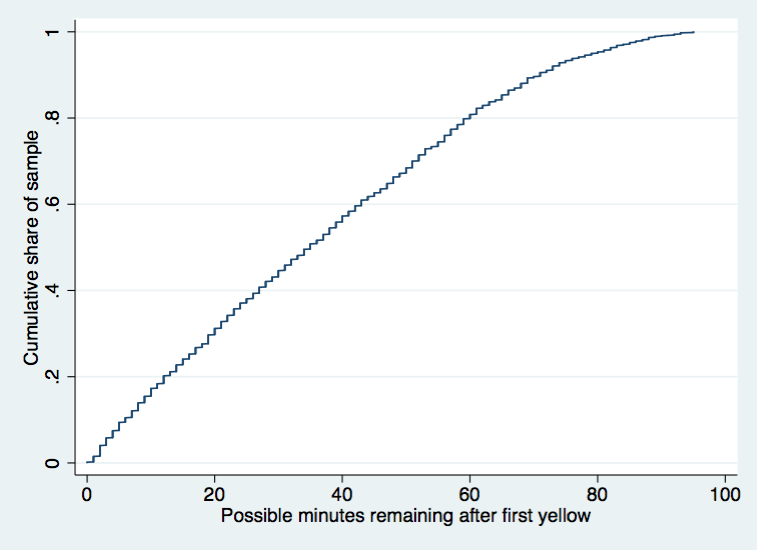 Another way of looking at these data is to consider how many minutes a player can still be on the field after a first yellow, barring a red card or a substitution. Here is a cumulative distribution of first yellow cards by the possible minutes remaining when they were issued: