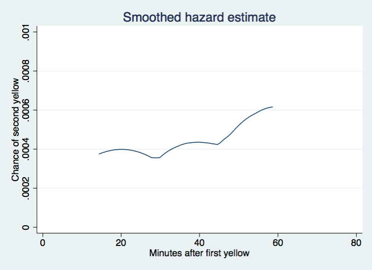 We can find the probability of receiving a second yellow in any given minute by looking at a “smoothed hazard estimate”, which tries to create a trend to match the underlying probabilities: