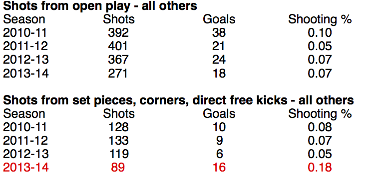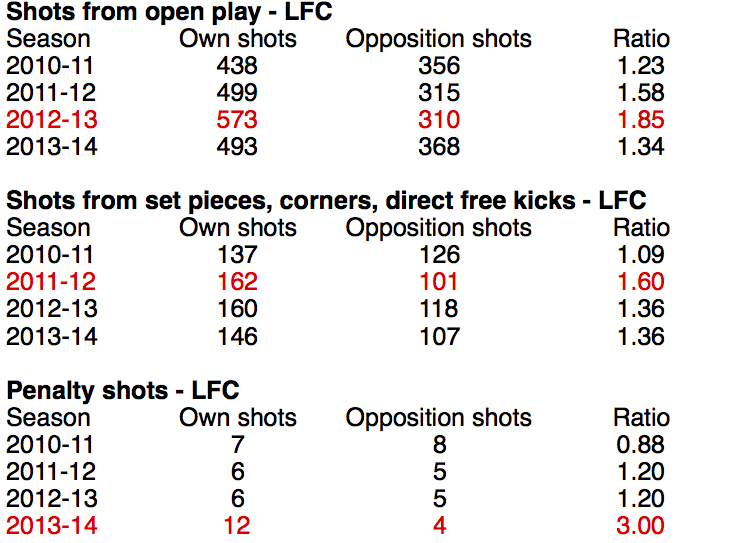 For starters, the edge in penalty shots in 2013-14 was so high that it looked very unlikely to repeat itself anytime soon. And the other categories offered more reason for pause. Liverpool was most dominant in shooting from open play in 2012-13; in shots from set pieces, crosses, and direct free kicks, their biggest edge came in 2011-12.