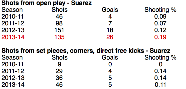 Put simply, his shooting from open play was unprecedented in his Premier League career. In fact, in the past four seasons, only four players with at least 50 shots bested Suárez’s shooting percentage: Dimitar Berbatov in 2010-11 (21% of 85 shots), Sergio Agüero in 2013-14 (21% of 73 shots), Robin Van Persie in 2010-11 (21% of 73 shots), and Daniel Sturridge in 2013-14: