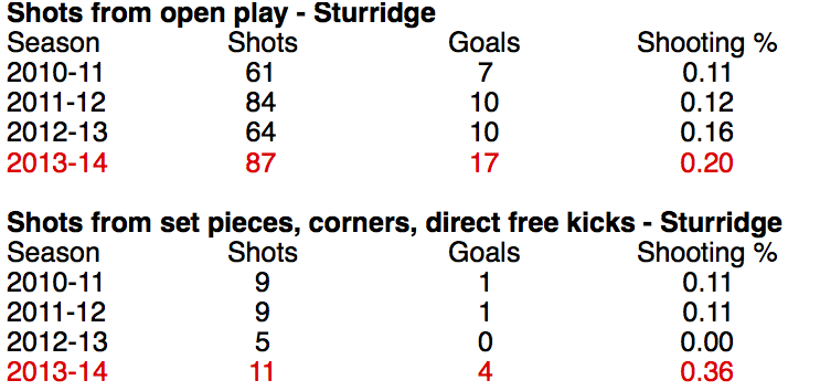 Sturridge had never before shot so well from open play, either, and his shooting from set pieces, corners, and direct free kicks was also unusually good (albeit in a small sample). The rest of Liverpool’s players were hardly outstanding when shooting from open play, but their shots from set pieces, corners, and direct free kicks were shockingly accurate, too: