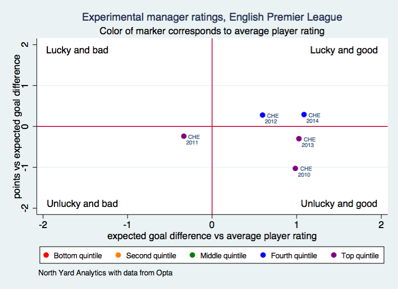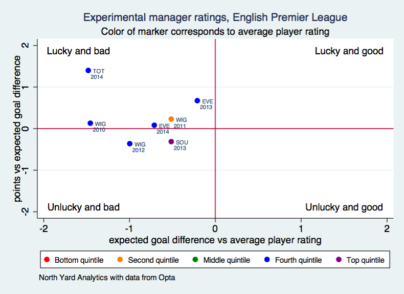 For now, I think there are two lessons to be drawn from this analysis: 1) Managerial ability often carries over between clubs, and 2) managers do have lucky seasons. If I ran a club, I’d think twice about hiring a manager who was a habitual underperformer, and I’d also consider sacking a manager who underperformed after more than a year in charge.