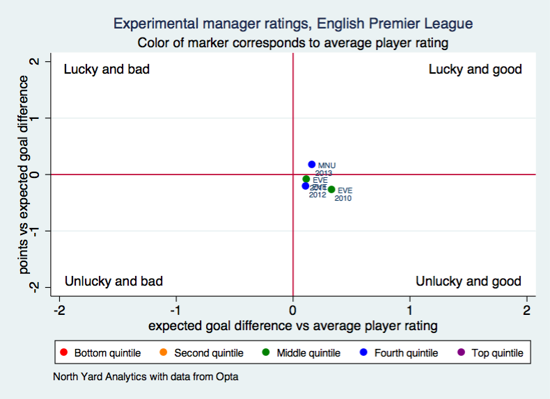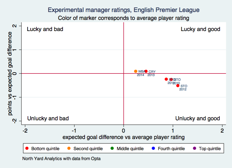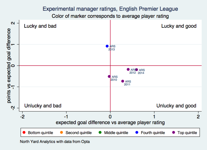 It’s possible that “luck” is proxying for different styles of play here. Some styles, such as Swansea’s passing approach under recent managers or Stoke under Tony Pulis, may not be the most efficient at converting my measure of player ability into scoring opportunities. But then again, Arsenal have had complete continuity in their manager and to a great degree in their style, yet the club has still had lucky and unlucky seasons by my metric.