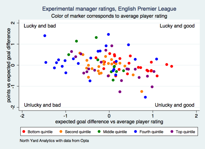 Since publishing my experimental analysis of managers yesterday, I’ve received some questions about luck and positions in the table. Earlier today I clarified the post to explain why, in a table fixed at twenty positions, it’s hard to be both very lucky and very good or very unlucky and very bad. I thought it would be worth showing what happened when I relaxed this constraint.