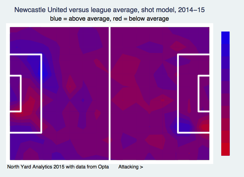 The next graph is essentially an overlay of player mappings from the shot-based model. It shows where Newcastle’s actions have had better or worse results – in terms of creating shots or allowing the opposition to do so – than the league average for actions at the same location. Here blue areas are above average, and red areas are below average: