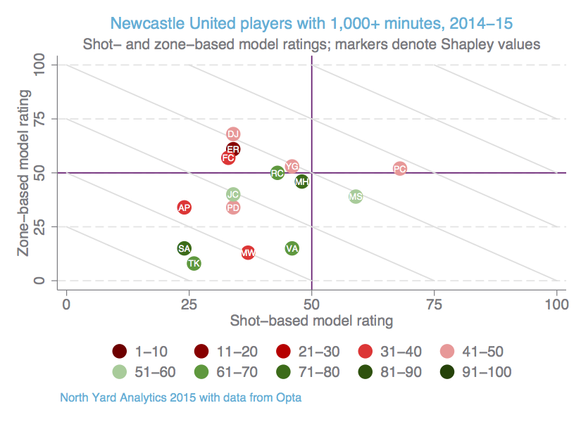 First, ratings from different models can be combined to show who’s most important to a team. The graph below shows 2014-15 ratings from two of my models (explained here) along with Shapley values for the club I support, Newcastle United. Shapley values aren’t as persistent from season to season as the other models’ ratings, but they can help to suggest who’s a misfit on a team and who’s pivotal. The diagonal lines consist of combinations of ratings that have the same total. If each model has equal importance, then players along the same diagonal line should be equally useful as well.