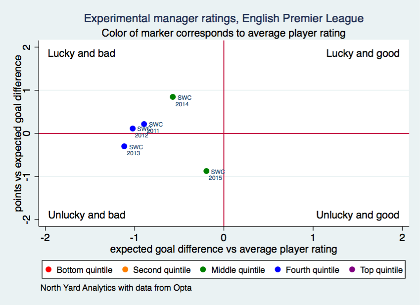 (Here a “good” manager is one who achieves better underlying results than predicted by one of NYA’s metrics for the innate ability of the squad. A “lucky” manager is one whose team wins more points than those underlying results would normally garner in the Premier League. The colors of the dots indicate the quality of the squad, weighted by actions on the field, relative to historical averages. The numbers behind the chart are adjusted for the strength of the opposition in each match and do not consider the portions of matches where one or more teams is playing with fewer than 11 men.)